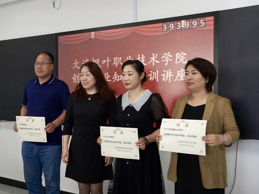同时,我院特聘请三位大咖嘉宾(大连市创业导师)为大连枫叶职业技术学院创业导师,院长助理张冬冬为三位导师颁发聘书。