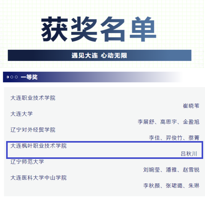 本次大赛由大连市委宣传部、大连市文化和旅游局、大连文化旅游发展集团和中国联通大连市分公司共同主办,大连市创新创业教育联盟、辽宁师范大学、大连市食品行业协会和大连博众广告传媒有限公司联合举办。本次大赛吸引了来自全市24所高校的优秀学子参与,总计有6所学院获得一等奖。