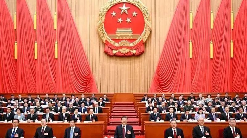 人民大会堂大礼堂气氛庄重热烈,主席台帷幕正中的国徽与会场穹顶上的五角星灯交相辉映。