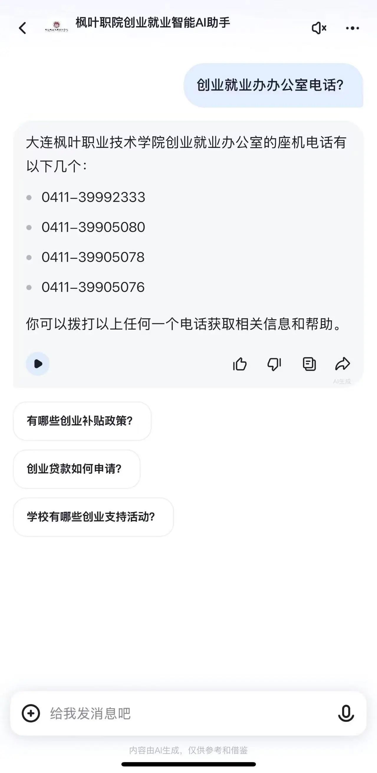 正在为找创业就业信息发愁?别慌!大连枫叶职业技术学院创业就业智能AI助手来帮你。想知道创业就业办公室电话?这儿有:0411 - 39992333、0411 - 39905080 等。无论是创业补贴政策、创业贷款申请,还是学校创业支持活动,都能咨询。赶紧拿起电话,开启你的创业就业之路!