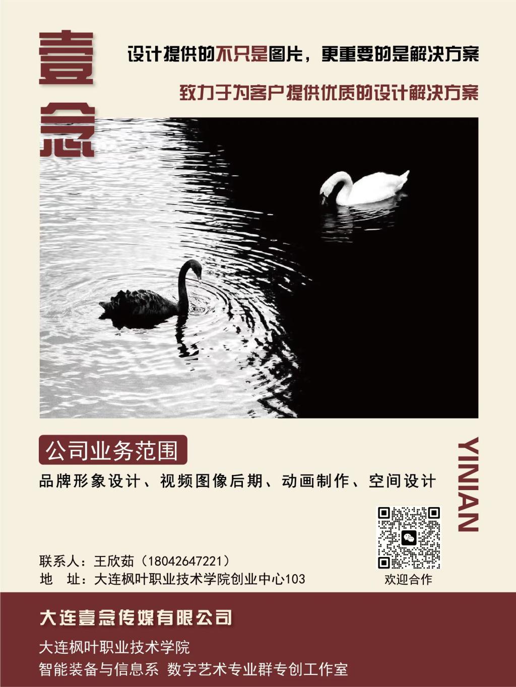 大连壹念文化传媒有限公司是智能装备与信息系数字艺术设计专业群创建的专创工作室,由分别在视频拍摄及制作、平面设计、动画制作以及环境艺术设计方面多年工作经验的三位双师型教师带领学生创办,经营范围包含: