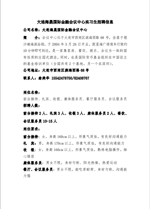 招聘信息|大连海晟国际金融会议中心实习生招聘信息