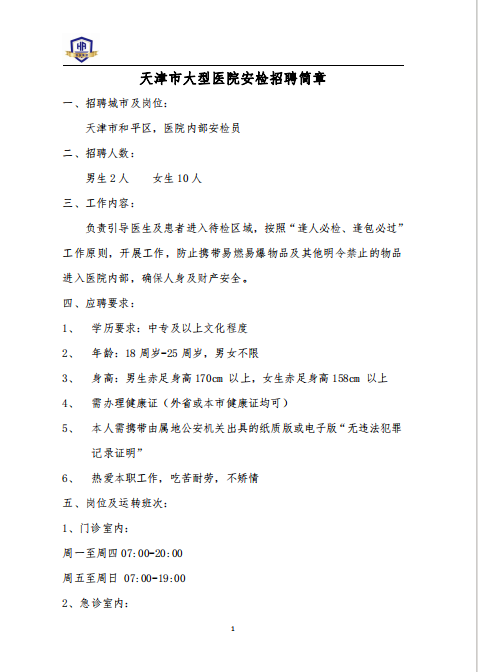 招聘信息|天津市大型医院安检