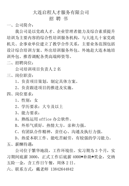 招聘信息|大连启程人才服务有限公司