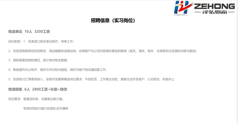 招聘信息|泽弘物流