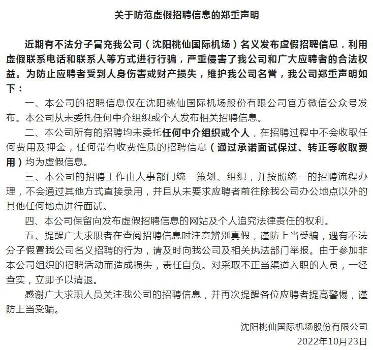 本公司的招聘信息仅在沈阳桃仙国际机场股份有限公司官方微信公众号发布。所有的招聘环节均由沈阳桃仙国际机场股份有限公司人事行政部组织进行,确保公开平等,竞争择优。整个招聘过程不收取任何费用,请应聘者不要轻信社会上的不当信息,不要向任何组织或个人缴纳与本次招聘有关的任何费用。我公司只接受个人报名,对采取不正当渠道入职的,一经查实,立即予以清退,涉嫌犯罪的报司法机关追究法律责任。