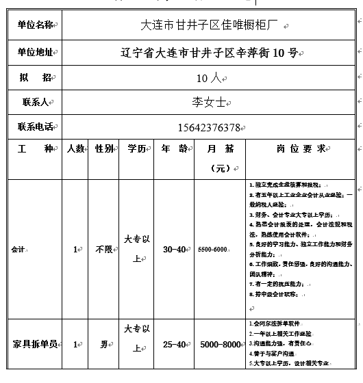招聘信息|大连市甘井子区佳唯橱柜厂