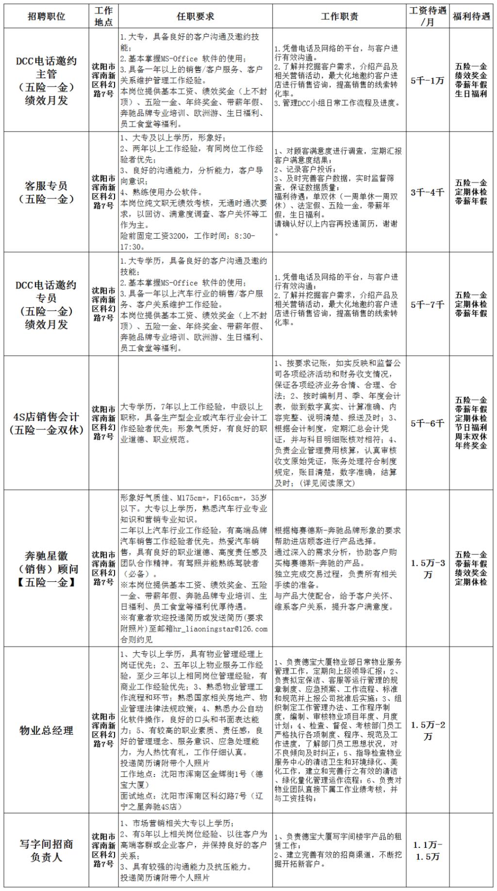 辽宁之星真诚欢迎您的加盟,在这片充满机遇与挑战的天空里绽放夺目的光辉。公司将为员工提供良好的企业文化、全球统一的奔驰价值观、卓越的工作环境、极具市场竞争力的薪资、五险一金、带薪年假、定期体检、年底双薪、绩效奖金、生日福利、员工食堂等福利、每年全体员工出国旅游感受不凡的团队体验,以及专业的培训和事业发展的机会。