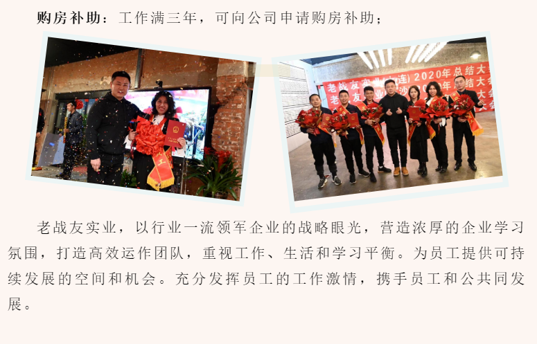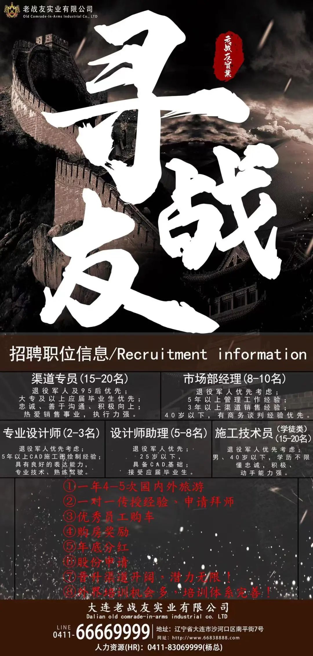 老战友实业有限公司现为中国人民解放军第16集团军、第89集团军、第40集团军、锦州65631部队以及现大连退役军人事务局的定点培训基地和长期输送退伍复转军人的实习单位,并且是中国人民解放军预备役高射炮兵第二师第二团应急分队,大连市沙河口区民兵应急分队。同时也是大连暖通协会会长单位,大连装饰协会会长单位,大连民政局重点扶持单位,首创大连独家地暖行业会员制服务体系。