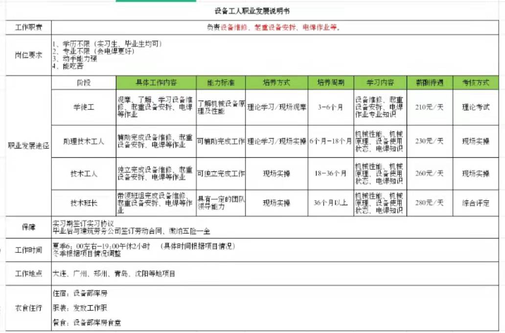 设备工人:学历不限、专业不限(电焊优先)、能吃苦。