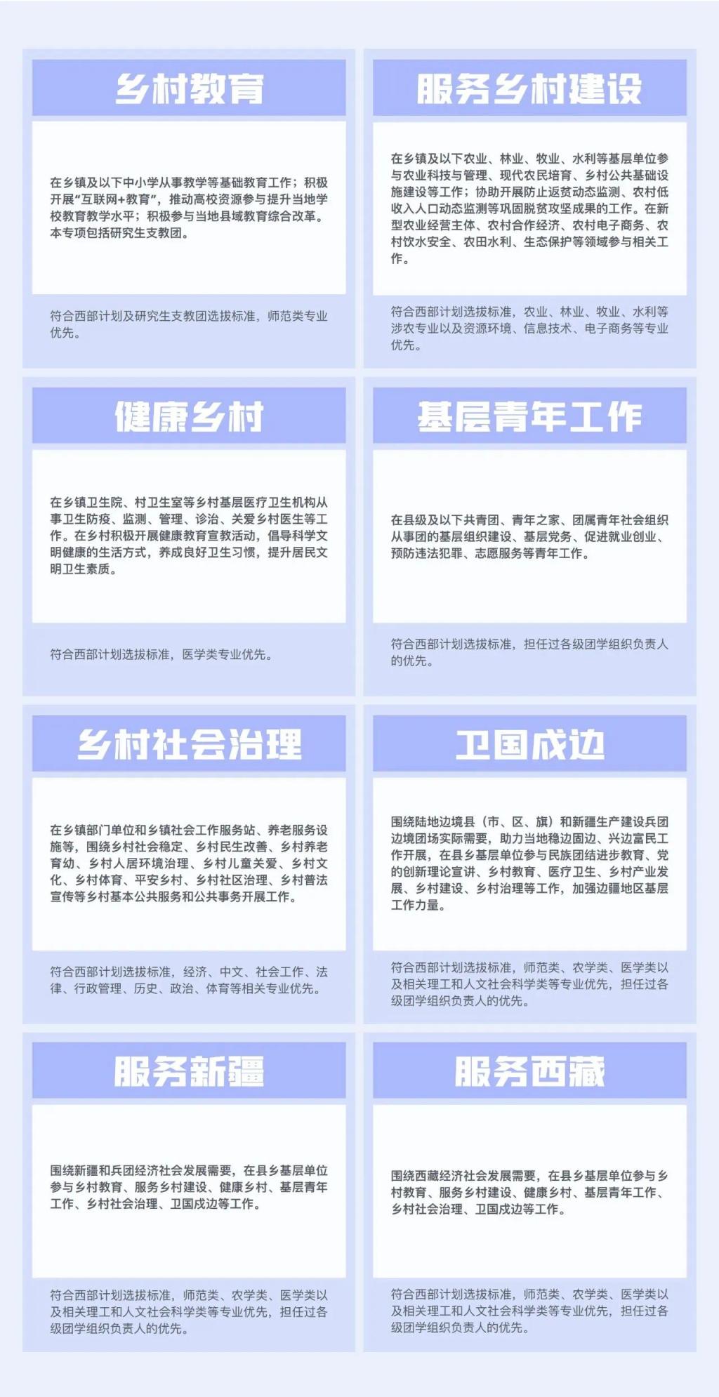 2025年大学生志愿服务西部计划报名通道已开启,3月1日起至5月上旬,普通高等学校应届毕业生或在读研究生,可在西部计划报名系统中注册报名。今年预计新招募西部计划志愿者约5万人。西部计划设乡村教育、服务乡村建设、健康乡村、基层青年工作、乡村社会治理、卫国戍边、服务新疆、服务西藏等8个专项,90%以上服务岗位设置在乡镇及以下。西部计划志愿者服务期为1至3年,服务协议一年一签。为激励志愿者服务期满继续扎根基层,国家在升学、就业、培训培养等多个方面给予政策支持。