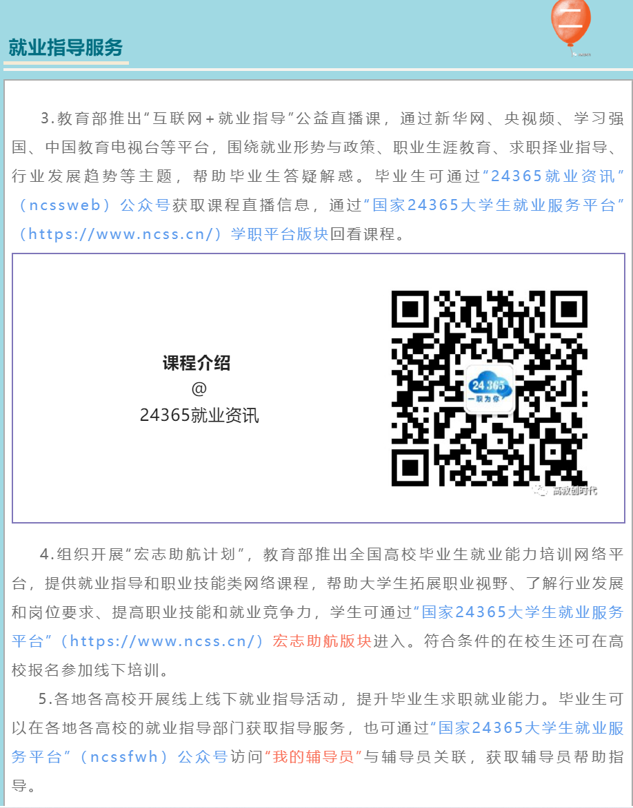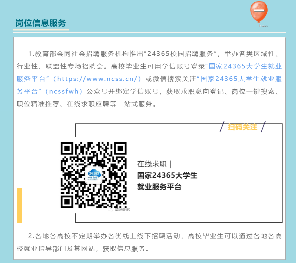 为促进高校毕业生更加充分更高质量就业,今年4月份,教育部在全国范围内组织开展高校毕业生就业创业政策宣传月活动,一系列就业创业政策为高校毕业生带来诸多利好。本期推出的《普通高校毕业生就业服务公告》,关于岗位信息、指导培训、签约登记、查询反馈等服务尽在其中。
