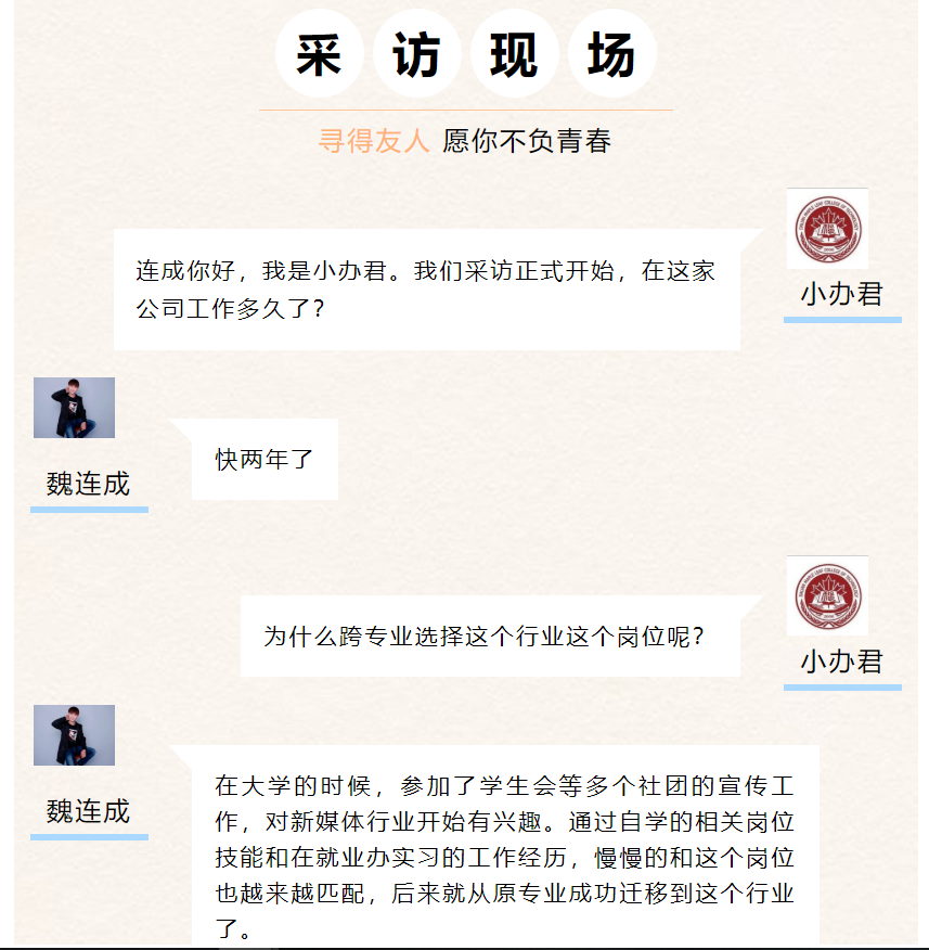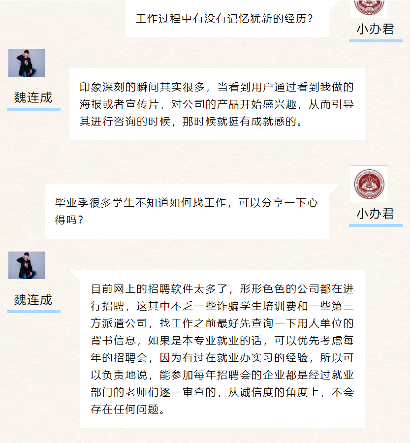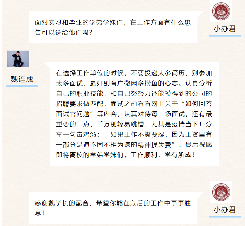 魏连成,大黑石校友。曾以实习生身份留校创业就业办工作一年。有才华,有内涵,稳重内敛。为人真诚,踏实认真。喜欢新媒体,凭自己的兴趣用心学,用心做。那时,只有遇到相关问题,同事们都会想到连成可以。他离校后,仍然在工作之余指导在校生如何做好新媒体。愿他在未来的工作中,顺心顺意。