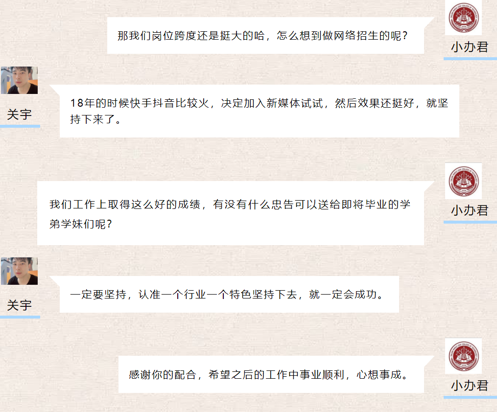 关宇,高新区校友。在校期间,任港湾艺术团声乐部副部长,但个人能力远超该职务。曾经预任命校文艺部部长,被他“无情”拒绝,他说只在港湾艺术团任职,瞬间“专一”指数拉满。毕业多年,我才知道,他在校心愿竟是“成为港湾艺术团团长”,真是造化弄人,不知当年的团长作何感想,哈哈。目前,他在沈阳的一所中职学校任职,现任职务是网络招生校长,下次见面我们需要叫一声“关校长”啦。他始终做着自己喜欢的事情,开心、快乐,永远那么有活力。愿关校长如意平安,永远是舞台上最耀眼的星。