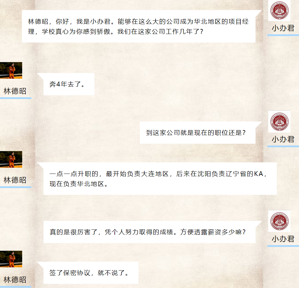 林德昭,税专校区校友。在校期间,任港湾艺术团团长,歌声绕梁,品德高尚。他体贴心细,总是把别人的情绪照顾得很好。与他相处无压力,很温暖。他阳光帅气,能力强,社团纳新时,竟有80%的学生因其颜值纷纷报名,且江湖传说:港湾艺术团纳新先看颜值。多年未见,知其一切安好,很是欣慰。愿工作顺利,小家幸福美满。